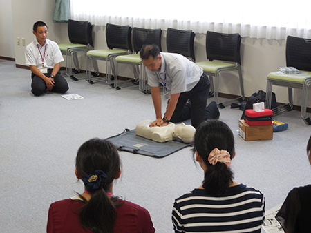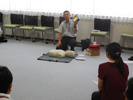 8/25(月)に本校教職員を対象に、AED(自動体外式除細動器)を用いての救急救命講習を行いました。