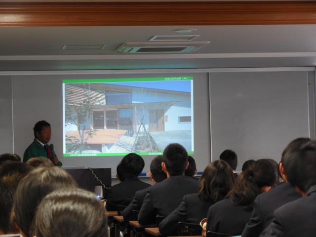 ご自身はプロのサッカー選手を目指され、現在は実家の家業を継がれ、日本一の木匠を目指されているそうで、生徒の心にダイレクトに響くお話の内容でした。強くお伝え頂いたことは「自分がなりたいものをイメージするという考える作業が大事であること。自分で行動し、表現していく。負けるものかの精神でやりきること。」で、講話の終わりには多くの生徒の目がキラキラ輝いていました。