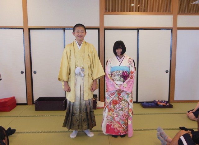 その後、和服の柄と形の意味を学び、紋付き袴と振袖の着装をしていただきました。