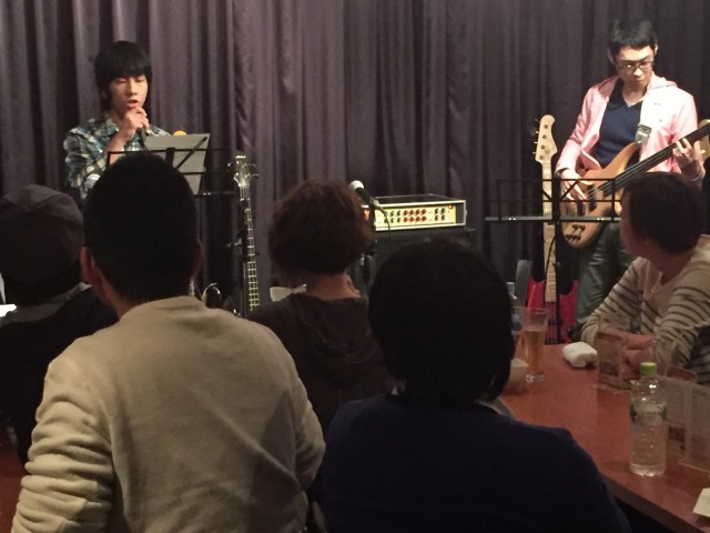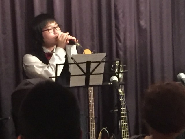 11月22日、KJホールで行われた『東門会』に参加しました。『東門会』は、本校軽音楽部の指導に来ていただいているYAMAHAエレクトリックベース科講師・東先生の生徒さんの発表会です。『東門会』のステージ上ではベースとヴォーカルのみ。ベースと歌の部分の音量を下げてある音源と共に演奏します。高校1年生と2年生のヴォーカル担当の生徒たちは、トランプで決められる順番に緊張していましたが、ステージで元気良く歌ってくれました。