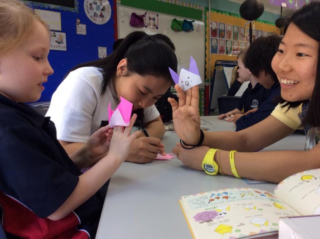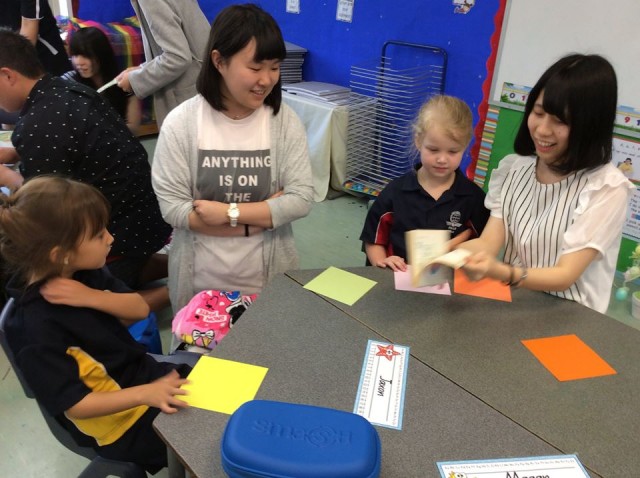 その後は、中学生は9歳のクラスに、高校生は、中学生と高校生のいるクラスに入り、活動しました。中学生は折り紙や遊具遊びをしながらコミュニケーションを楽しみ、高校生は、自己紹介や会話をした後、「ハンカチ落とし」と、オーストラリアのハンカチ落としに似た遊び、そして、「だるまさんが転んだ」と、それに似たオーストラリアの遊びをして楽しみました。自己紹介や会話では、一生懸命自分たちのことを伝えようとしていました。ゲームでは、海外にも同じような遊びがあって、開誠館の生徒も、ヒルズ学園の生徒も、楽しそうに、ひとつことに夢中になって取り組んでいることが、印象的でした。