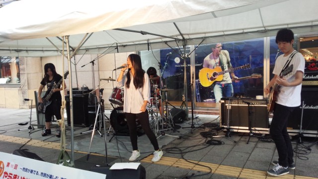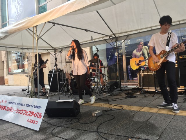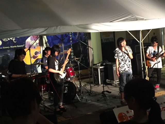 軽音楽部から、高校2年生3バンドが、ザザシティ西のステージで演奏をしました。高校1年生の部員のうち13人が、スタッフとして参加しました。