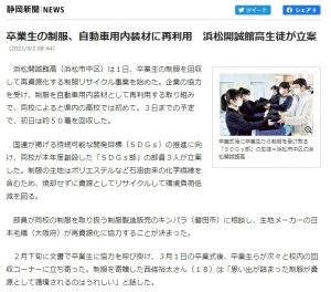 静岡新聞(3/2付:朝刊記事) 卒業生の制服、自動車用内装材に再利用 浜松開誠館高生徒が立案