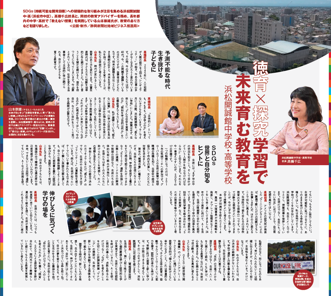本校校長の高橋千広と今年度より本校教育アドバイザーを務め、長年都内の中学・高校で「教えない授業」を実践している山本崇雄先生が、教育のあり方などを語り合う対談記事が6/19(土)付静岡新聞朝刊最終面に掲載されました。