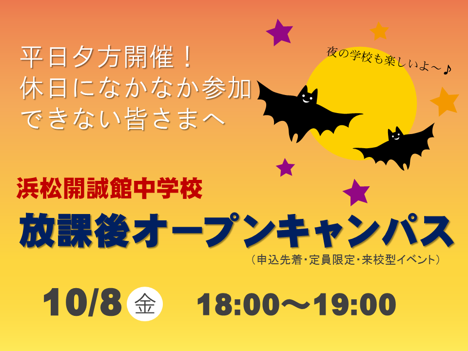 浜松開誠館中学校では、10月8日(金)に、小学生対象の「放課後オープンキャンパス」を下記の通り開催します。