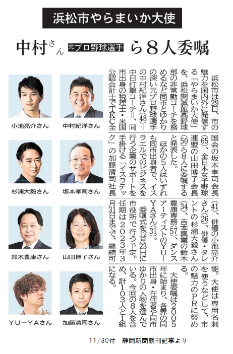 浜松市は本校野球部元非常勤コーチ・学園理事で中日ドラゴンズ打撃コーチの中村紀洋さんと、本校卒業生で俳優として活躍する小池亮介さんを「浜松市やらまいか大使」に委嘱したと発表しました。