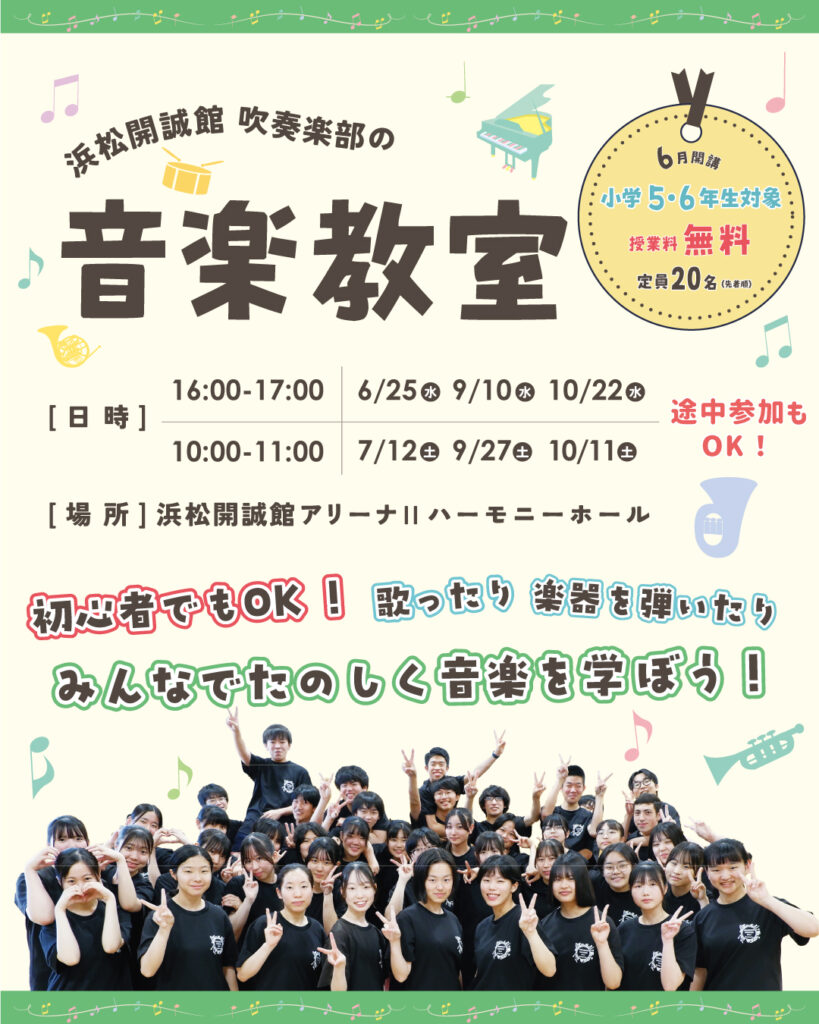 小学生5・6年生を対象とした浜松開誠館吹奏楽部の音楽教室を6月25日(水)より全6回開催します。
