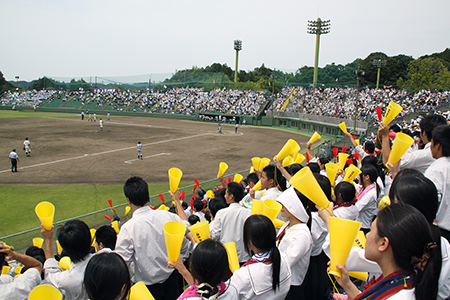 高校3年生は早朝からバスで掛川球場に向けて出発しました。本校では1~4回戦までを学年持ち回りでの全校応援で行っておりますので、高校3年生にとっては久々の野球応援となりました。また、活躍する主力選手たちも同級生・クラスメイトということで、一層応援にも熱が入りました。